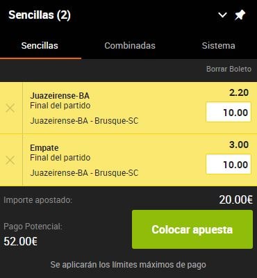 Apostar a que gana Juazeirense-BA 10 euros y apostar empate otros 10 euros. No hacerlo en combinada, tiene que ser apuesta sencilla.